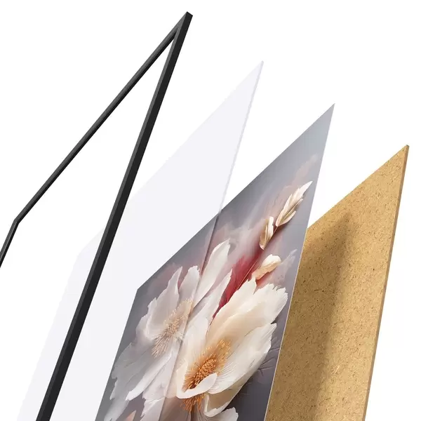El póster consta de marco, plexiglás, imagen impresa y soporte de aglomerado. El póster puede colgarse inmediatamente en la pared gracias a los soportes de la parte posterior.