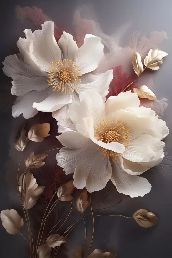 Poster Delicadas peonías con pétalos finos y tenues, rodeadas de hojas de color rojo oscuro y amarillo sobre un fondo abstracto. Nr f47435
