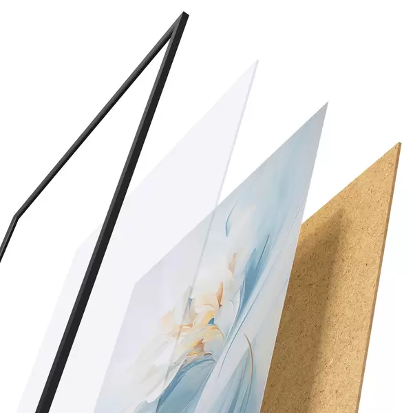 El póster consta de marco, plexiglás, imagen impresa y soporte de aglomerado. El póster puede colgarse inmediatamente en la pared gracias a los soportes de la parte posterior.