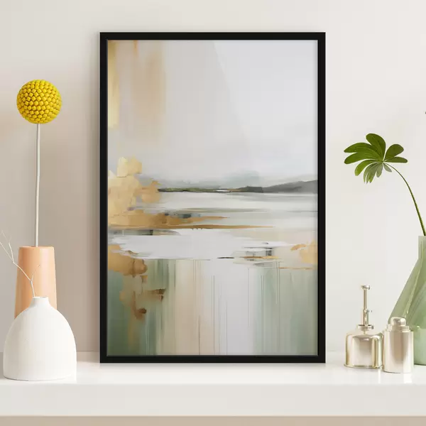 Poster Paisaje abstracto con tonos amarillos y verdes, agua que refleja el cielo y montañas lejanas, cielo pálido y brumoso. Nr f47438