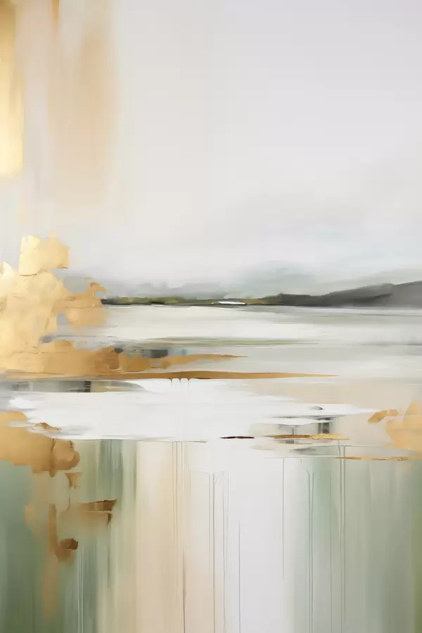 Poster Paisaje abstracto con tonos amarillos y verdes, agua que refleja el cielo y montañas lejanas, cielo pálido y brumoso. Nr f47438