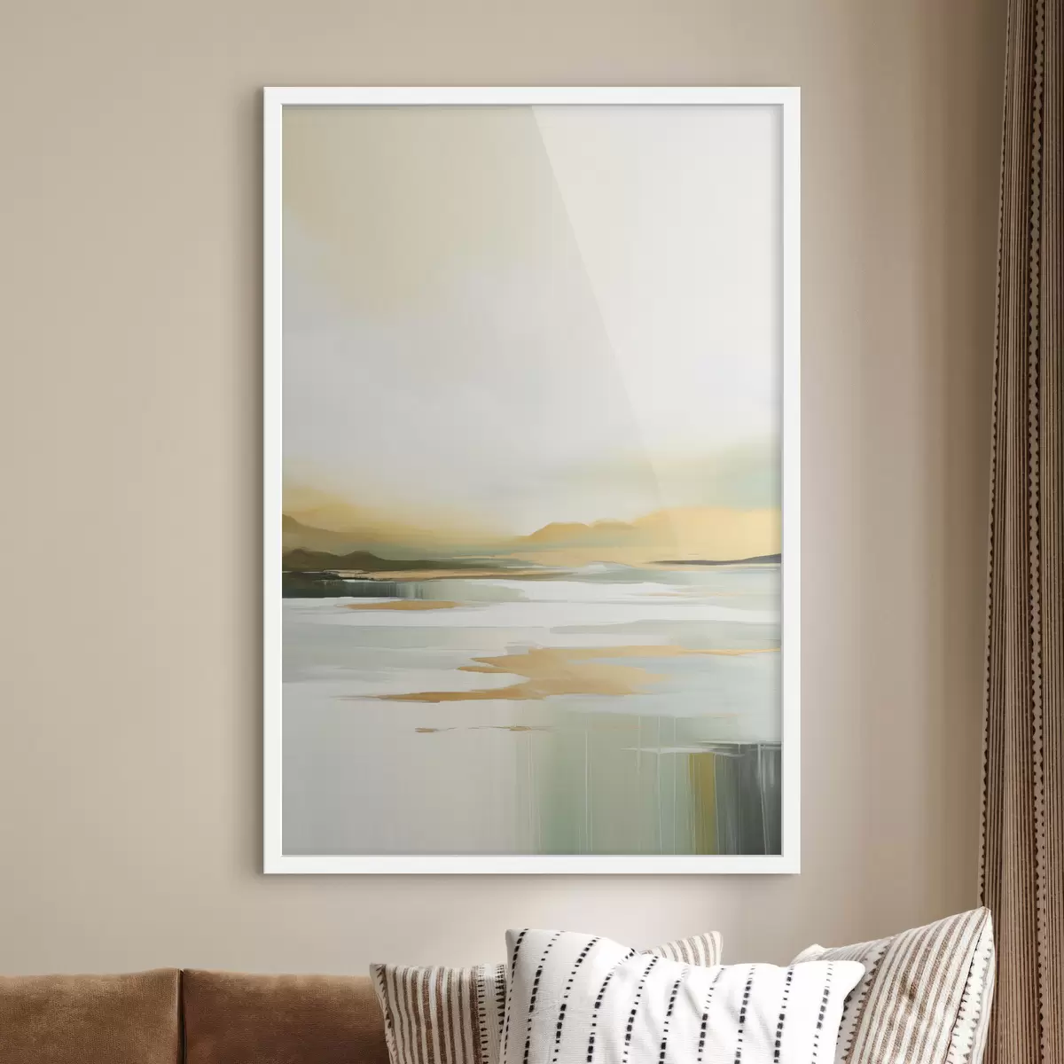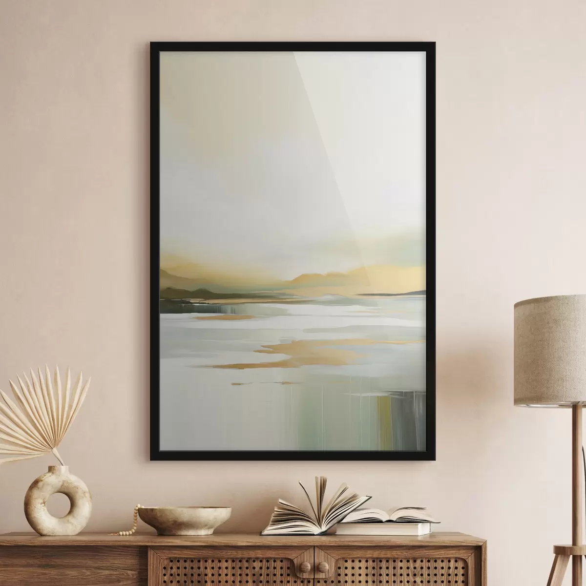 Poster Paisaje abstracto con tonos amarillos y verdes, agua que refleja el cielo y montañas lejanas, cielo pálido y brumoso. Nr f47439