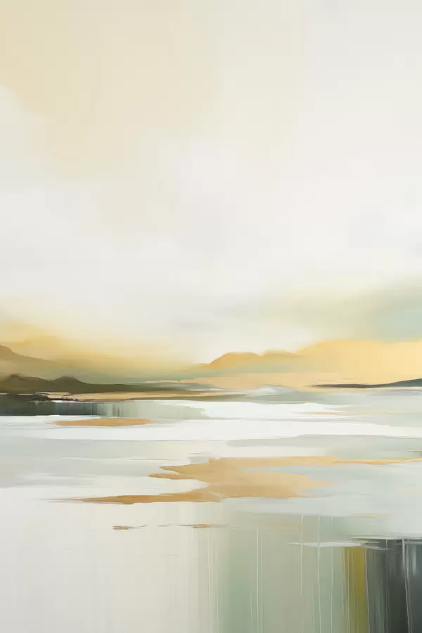 Poster Paisaje abstracto con tonos amarillos y verdes, agua que refleja el cielo y montañas lejanas, cielo pálido y brumoso. Nr f47439