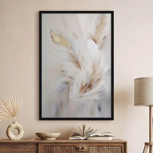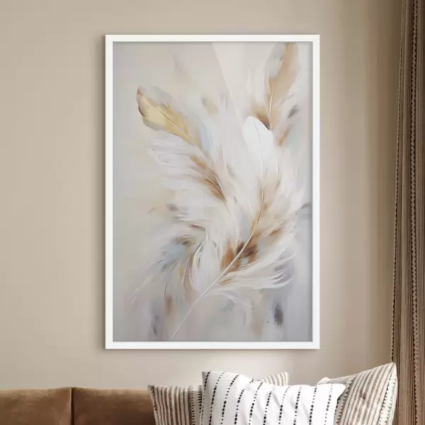 Poster Plumas grandes y suaves con una mezcla de tonos blancos, amarillos y marrones, sobre un fondo claro y abstracto. f47442
