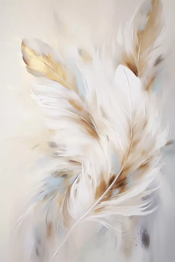 Poster Plumas grandes y suaves con una mezcla de tonos blancos, amarillos y marrones, sobre un fondo claro y abstracto. f47442