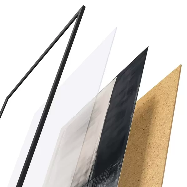 El póster consta de marco, plexiglás, imagen impresa y soporte de aglomerado. El póster puede colgarse inmediatamente en la pared gracias a los soportes de la parte posterior.