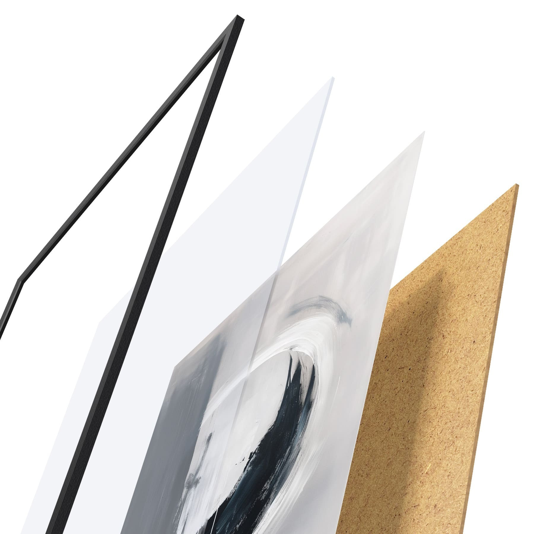 El póster consta de marco, plexiglás, imagen impresa y soporte de aglomerado. El póster puede colgarse inmediatamente en la pared gracias a los soportes de la parte posterior.