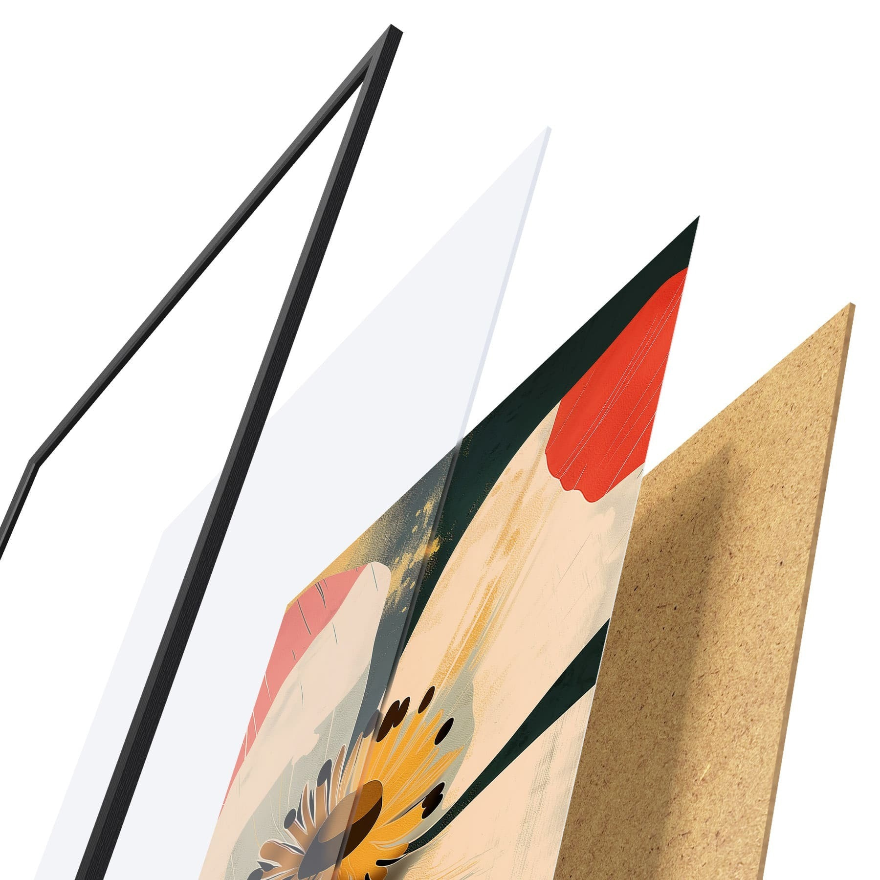 El póster consta de marco, plexiglás, imagen impresa y soporte de aglomerado. El póster puede colgarse inmediatamente en la pared gracias a los soportes de la parte posterior.