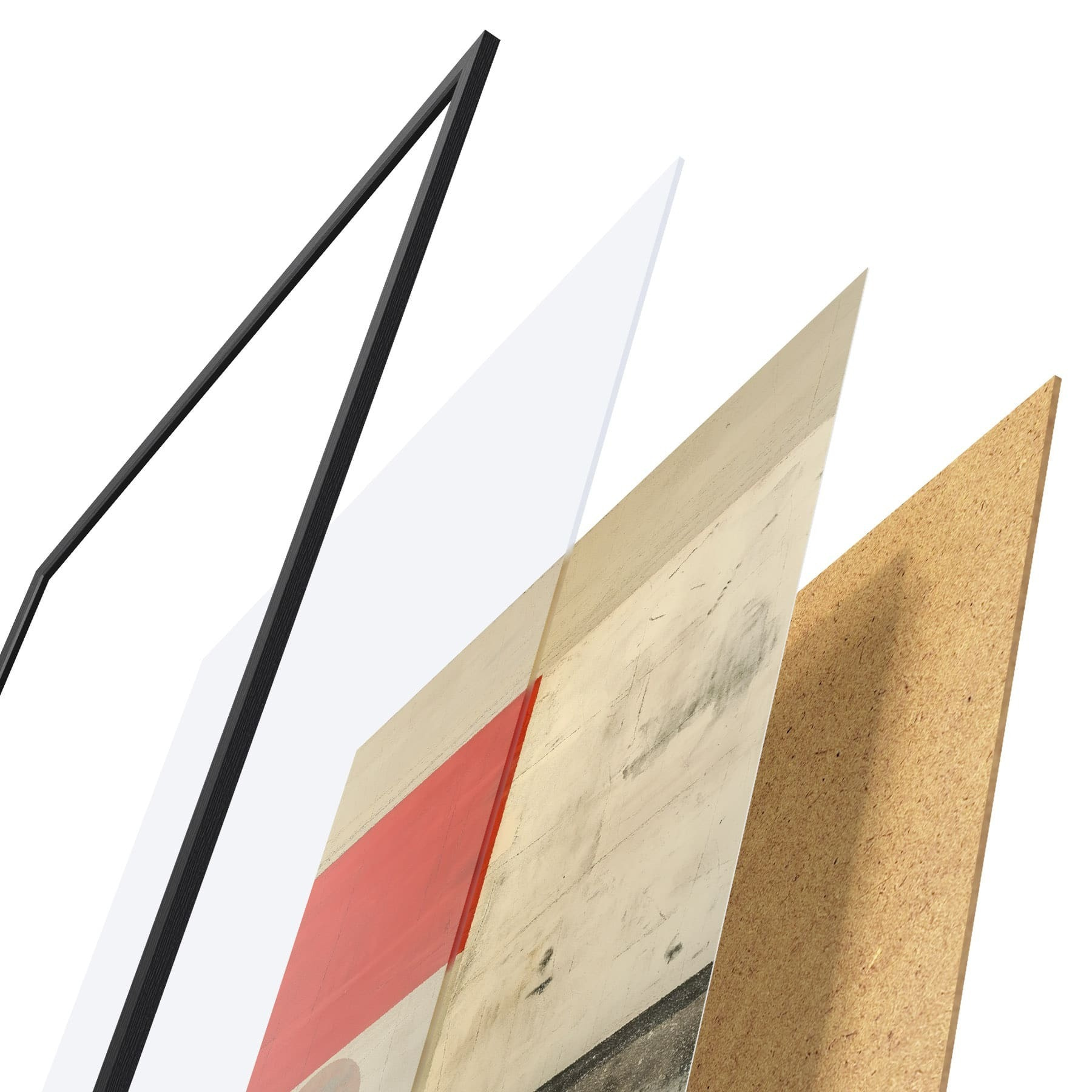 El póster consta de marco, plexiglás, imagen impresa y soporte de aglomerado. El póster puede colgarse inmediatamente en la pared gracias a los soportes de la parte posterior.