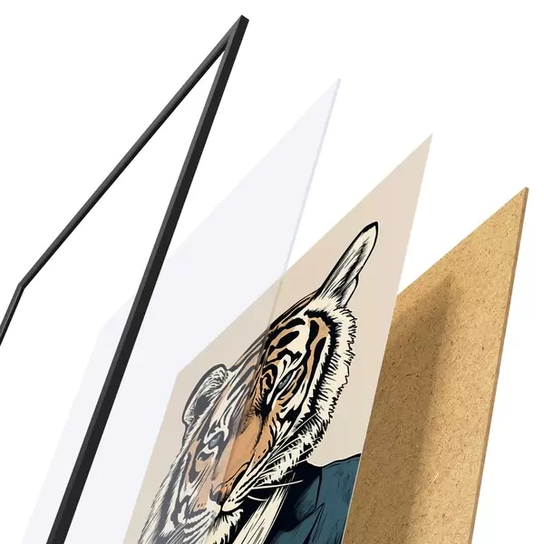 El póster consta de marco, plexiglás, imagen impresa y soporte de aglomerado. El póster puede colgarse inmediatamente en la pared gracias a los soportes de la parte posterior.