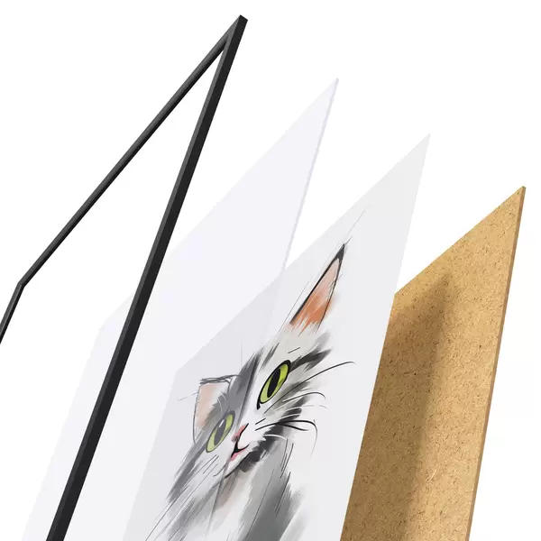 El póster consta de marco, plexiglás, imagen impresa y soporte de aglomerado. El póster puede colgarse inmediatamente en la pared gracias a los soportes de la parte posterior.