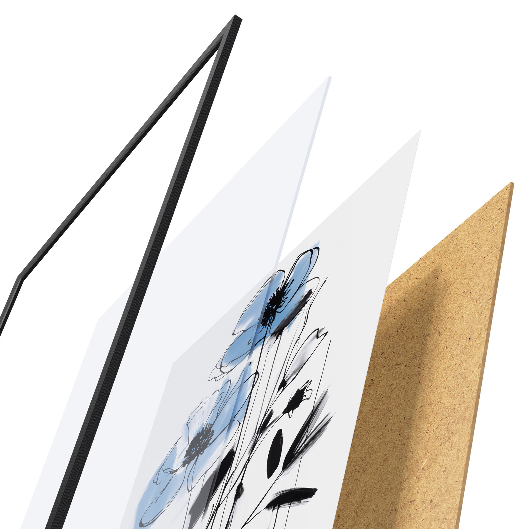 El póster consta de marco, plexiglás, imagen impresa y soporte de aglomerado. El póster puede colgarse inmediatamente en la pared gracias a los soportes de la parte posterior.