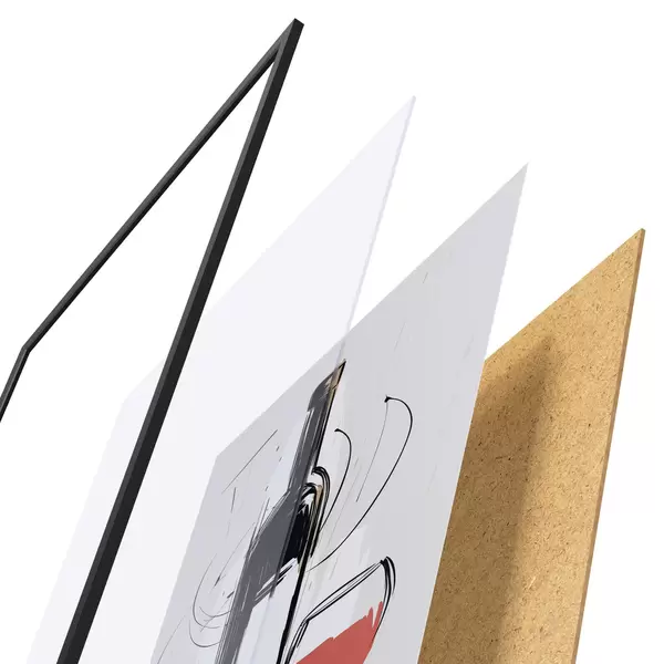 El póster consta de marco, plexiglás, imagen impresa y soporte de aglomerado. El póster puede colgarse inmediatamente en la pared gracias a los soportes de la parte posterior.