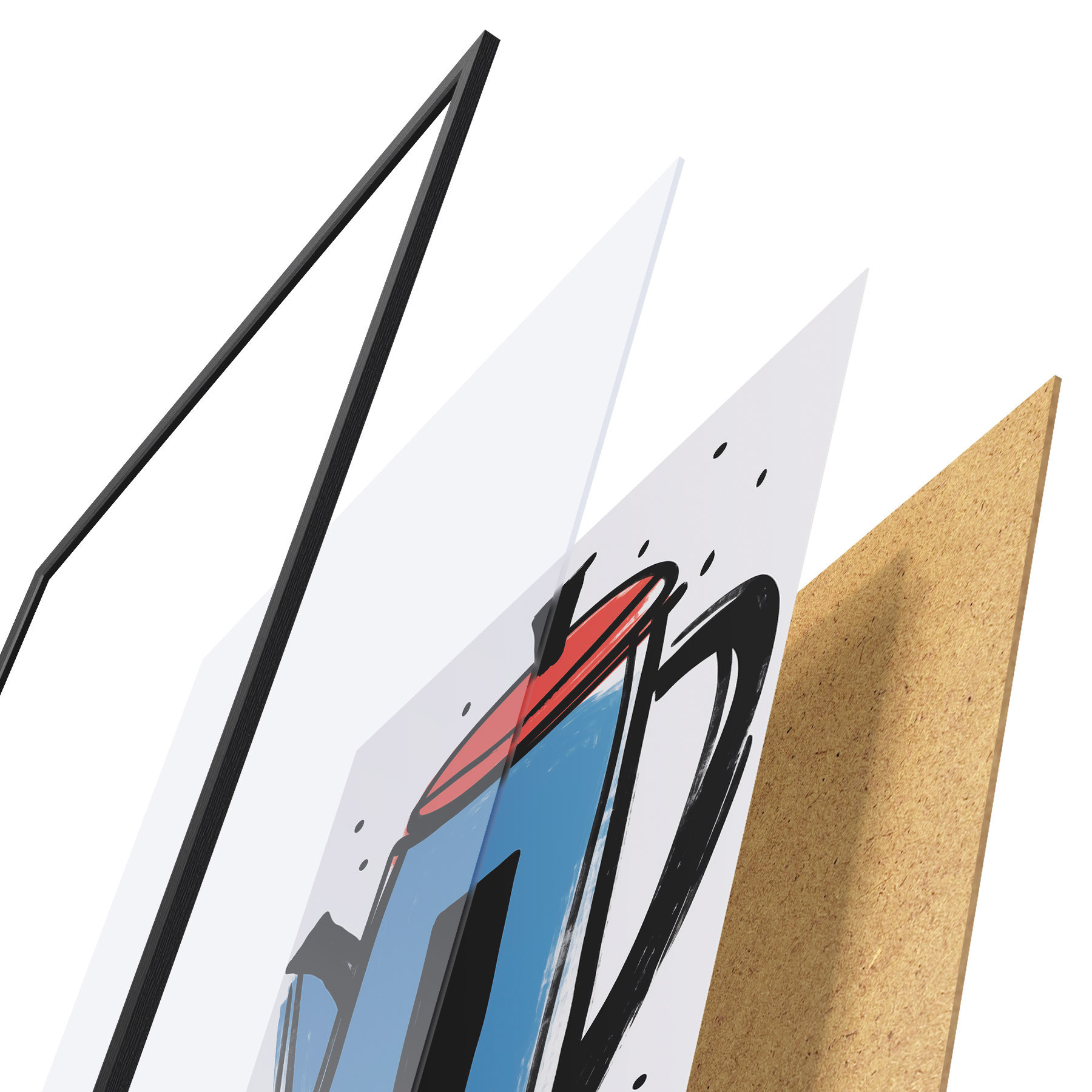 El póster consta de marco, plexiglás, imagen impresa y soporte de aglomerado. El póster puede colgarse inmediatamente en la pared gracias a los soportes de la parte posterior.