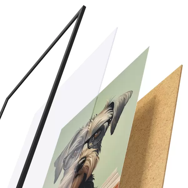 El póster consta de marco, plexiglás, imagen impresa y soporte de aglomerado. El póster puede colgarse inmediatamente en la pared gracias a los soportes de la parte posterior.