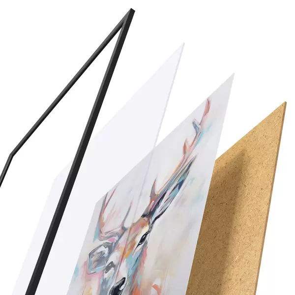 El póster consta de marco, plexiglás, imagen impresa y soporte de aglomerado. El póster puede colgarse inmediatamente en la pared gracias a los soportes de la parte posterior.