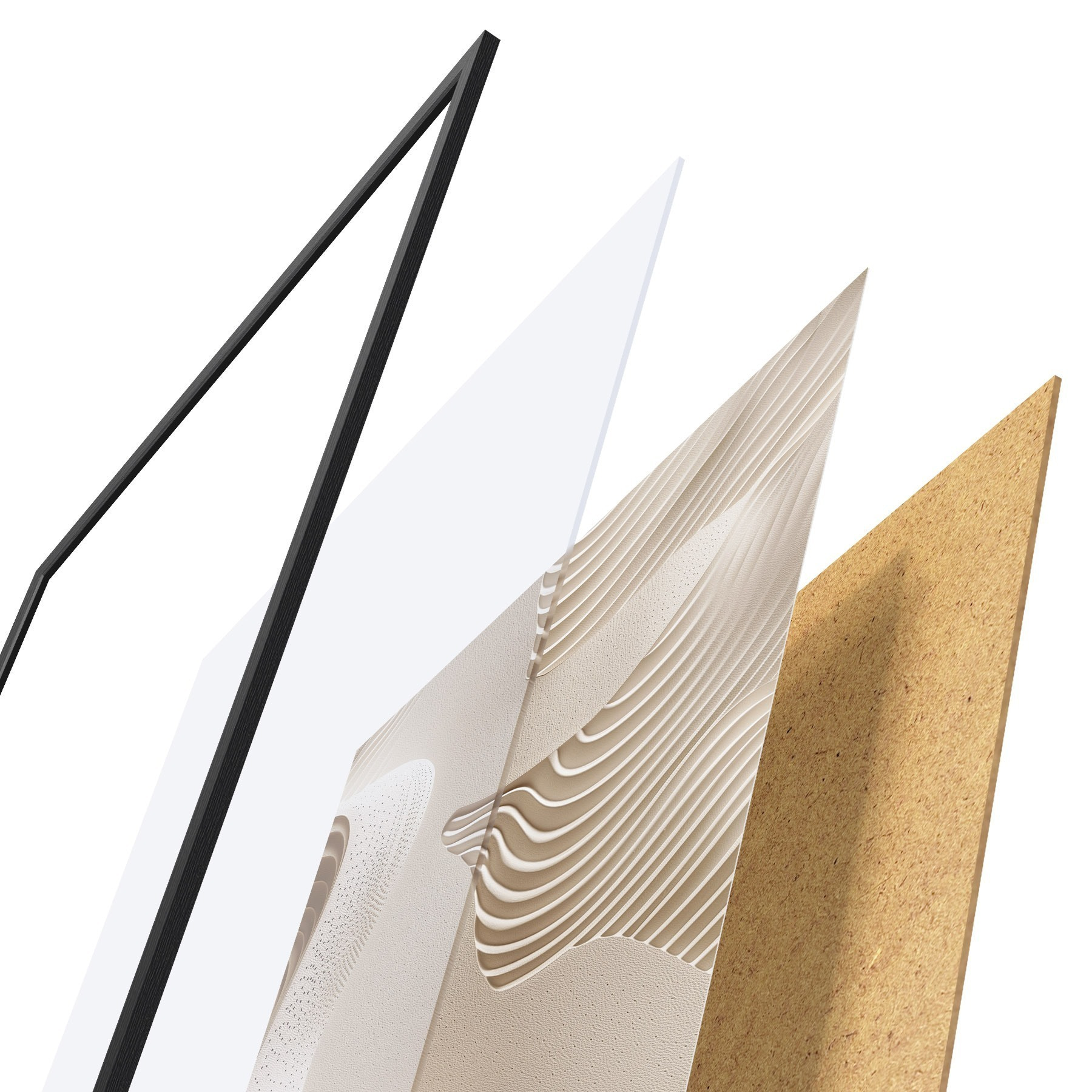 El póster consta de marco, plexiglás, imagen impresa y soporte de aglomerado. El póster puede colgarse inmediatamente en la pared gracias a los soportes de la parte posterior.