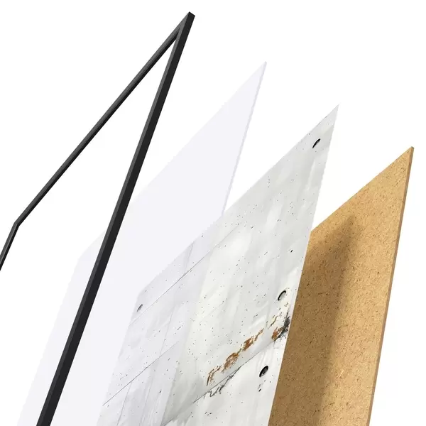 El póster consta de marco, plexiglás, imagen impresa y soporte de aglomerado. El póster puede colgarse inmediatamente en la pared gracias a los soportes de la parte posterior.
