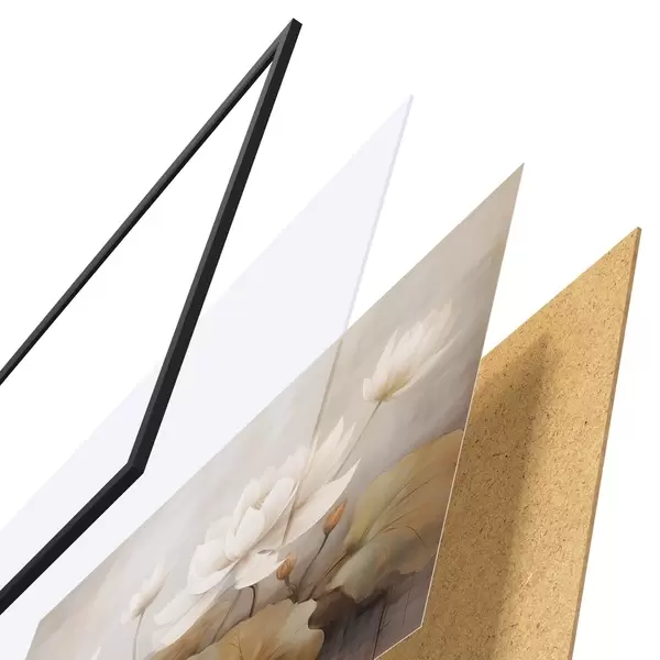 El póster consta de marco, plexiglás, imagen impresa y soporte de aglomerado. El póster puede colgarse inmediatamente en la pared gracias a los soportes de la parte posterior.