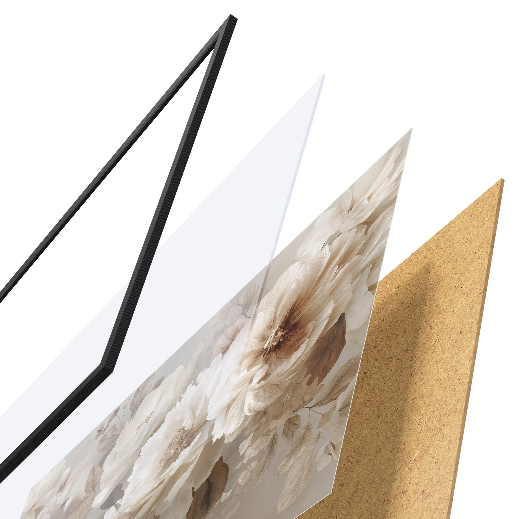 El póster consta de marco, plexiglás, imagen impresa y soporte de aglomerado. El póster puede colgarse inmediatamente en la pared gracias a los soportes de la parte posterior.