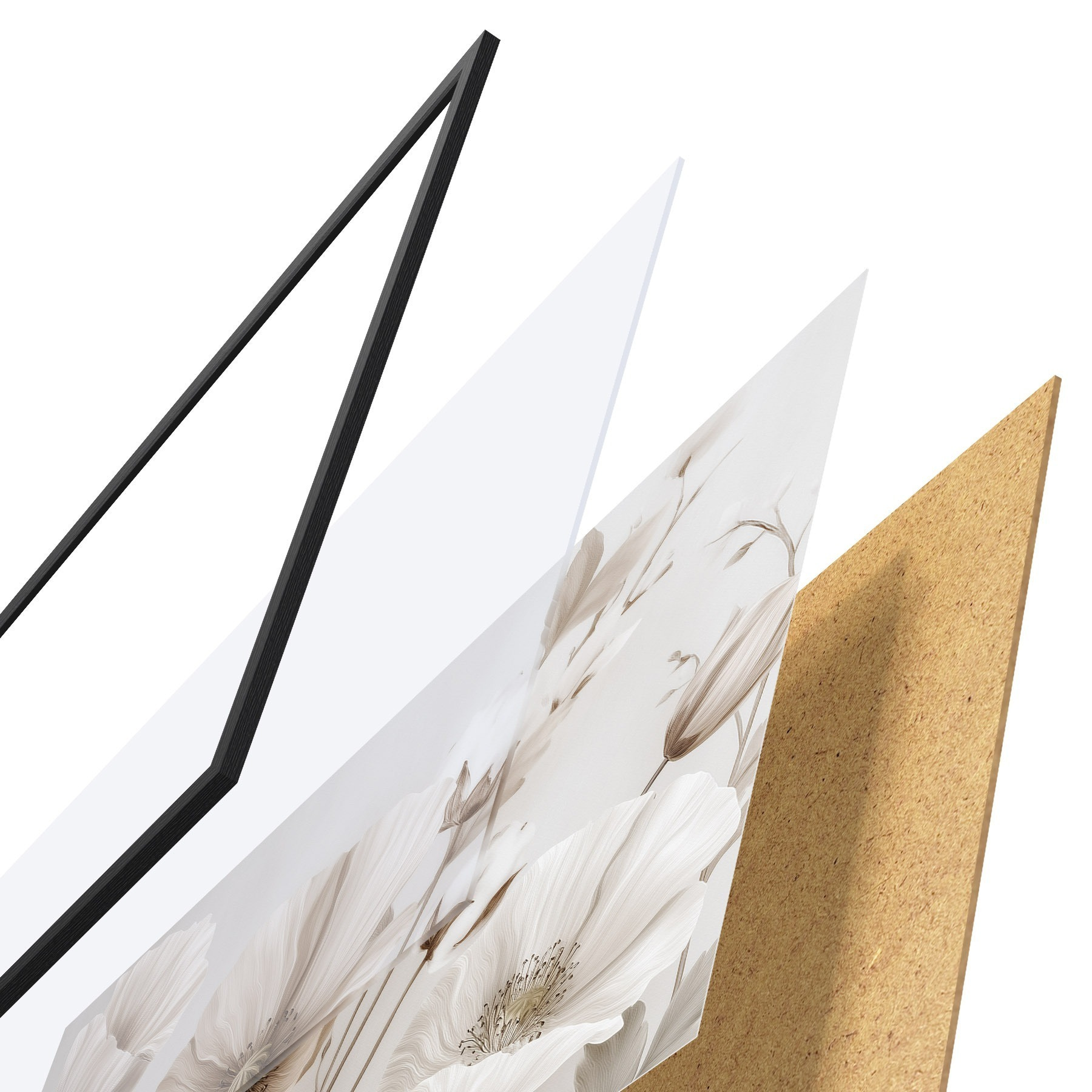 El póster consta de marco, plexiglás, imagen impresa y soporte de aglomerado. El póster puede colgarse inmediatamente en la pared gracias a los soportes de la parte posterior.