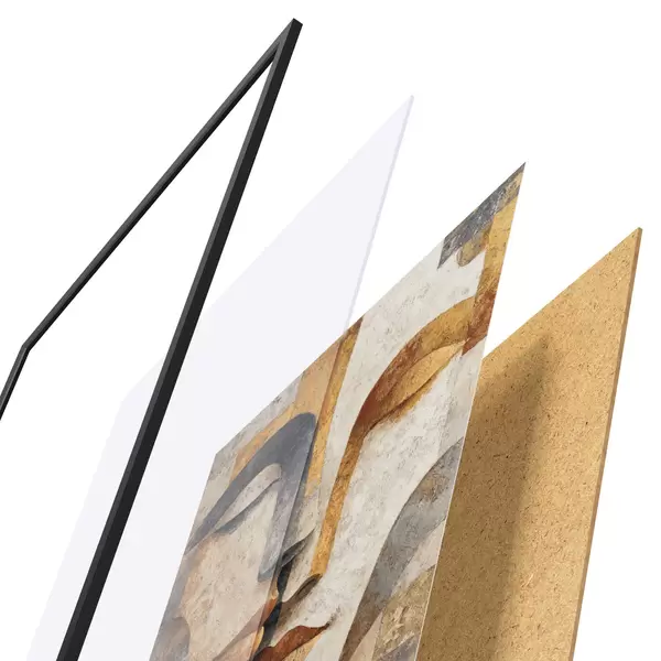 El póster consta de marco, plexiglás, imagen impresa y soporte de aglomerado. El póster puede colgarse inmediatamente en la pared gracias a los soportes de la parte posterior.