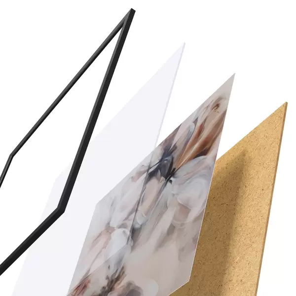 El póster consta de marco, plexiglás, imagen impresa y soporte de aglomerado. El póster puede colgarse inmediatamente en la pared gracias a los soportes de la parte posterior.