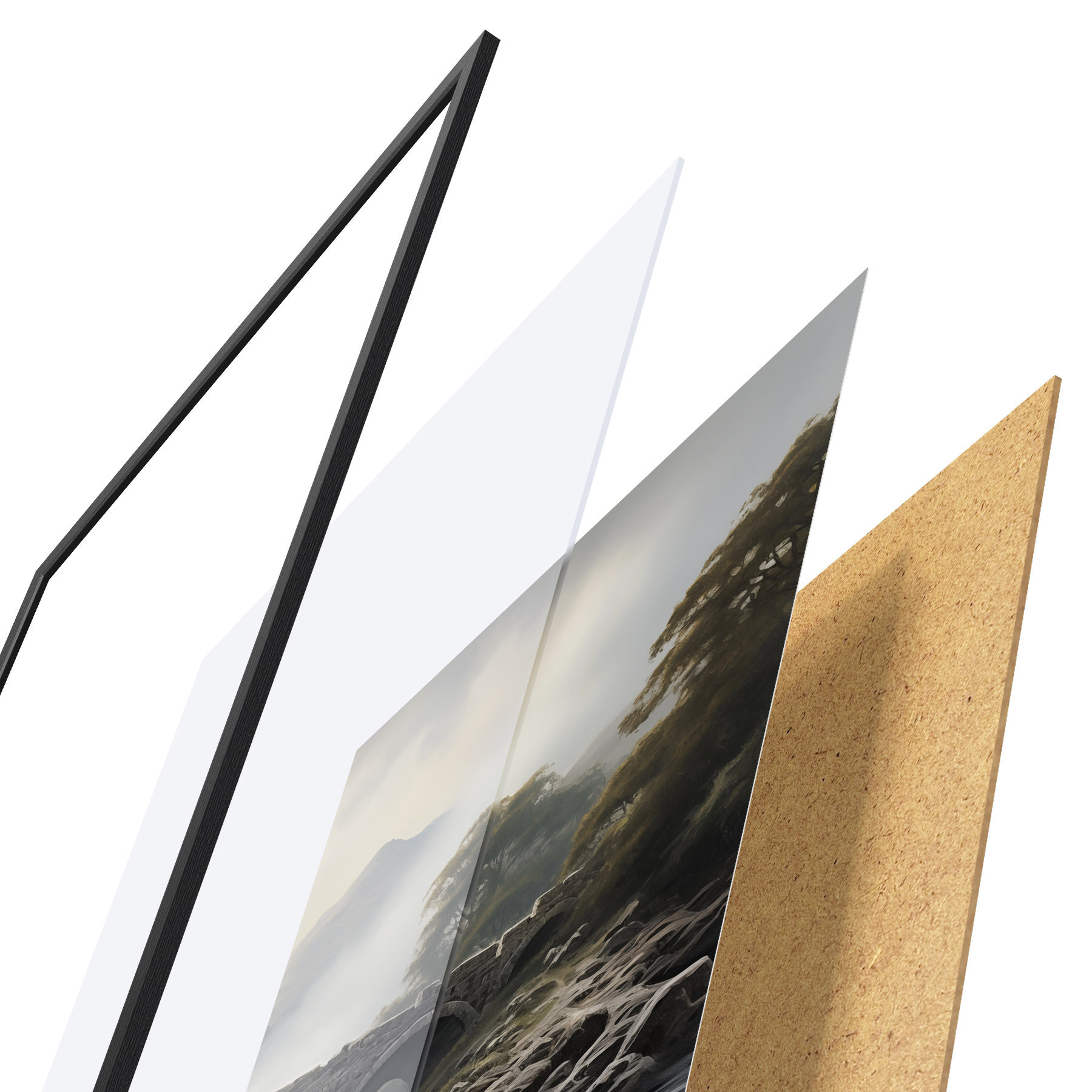 El póster consta de marco, plexiglás, imagen impresa y soporte de aglomerado. El póster puede colgarse inmediatamente en la pared gracias a los soportes de la parte posterior.