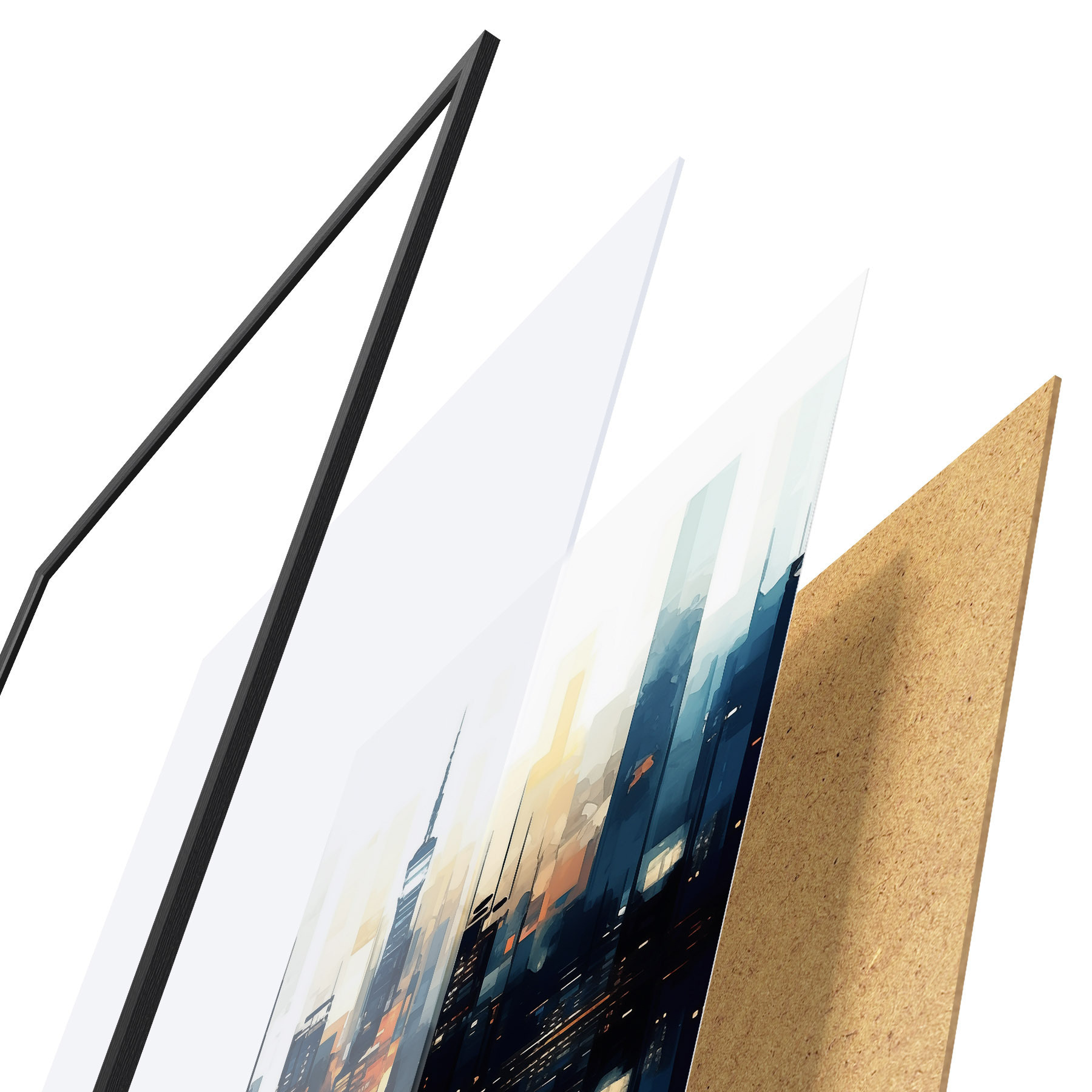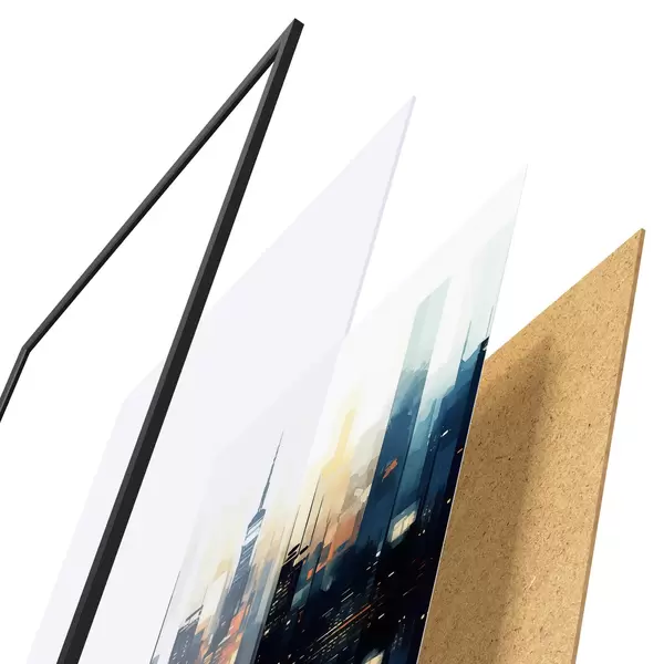 El póster consta de marco, plexiglás, imagen impresa y soporte de aglomerado. El póster puede colgarse inmediatamente en la pared gracias a los soportes de la parte posterior.