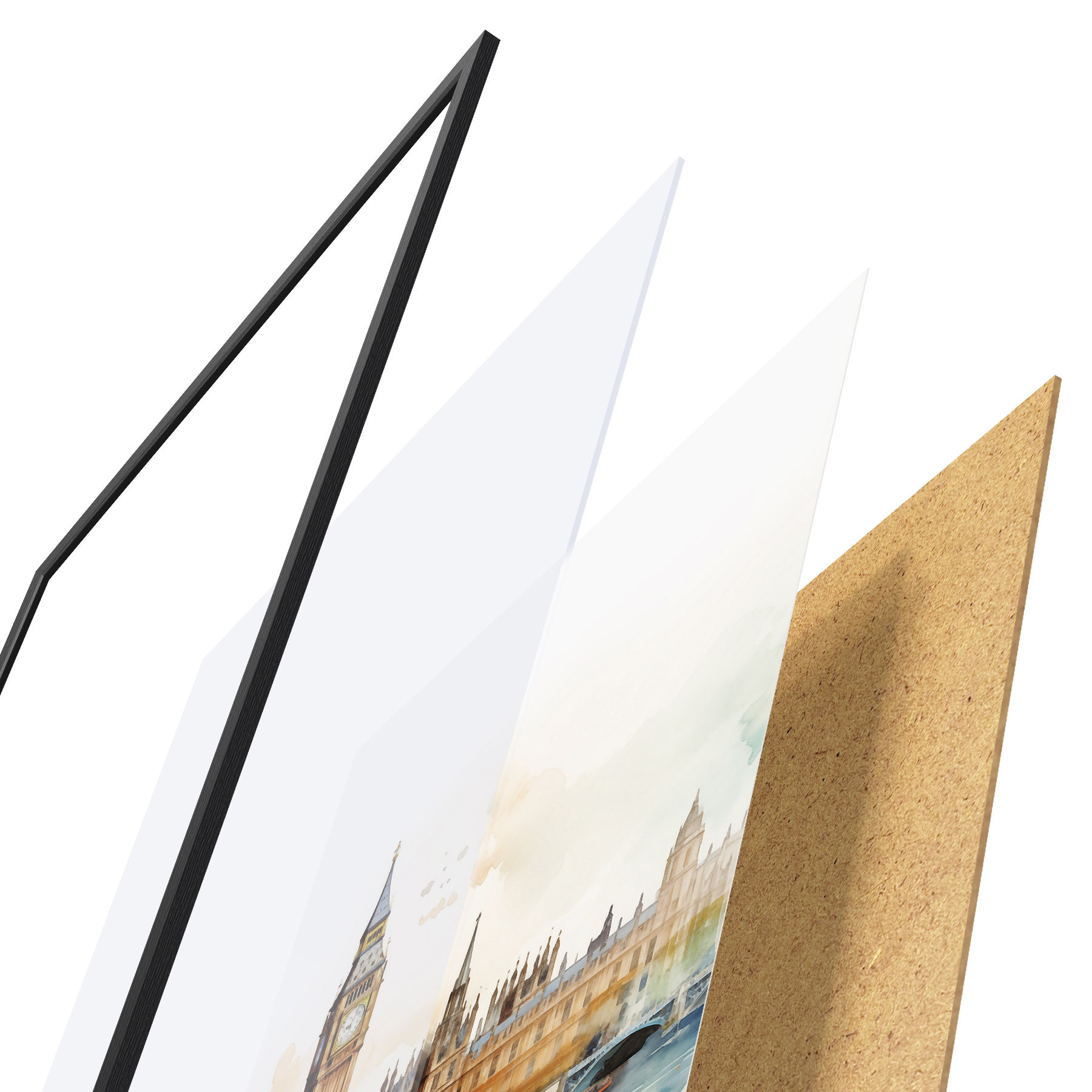 El póster consta de marco, plexiglás, imagen impresa y soporte de aglomerado. El póster puede colgarse inmediatamente en la pared gracias a los soportes de la parte posterior.