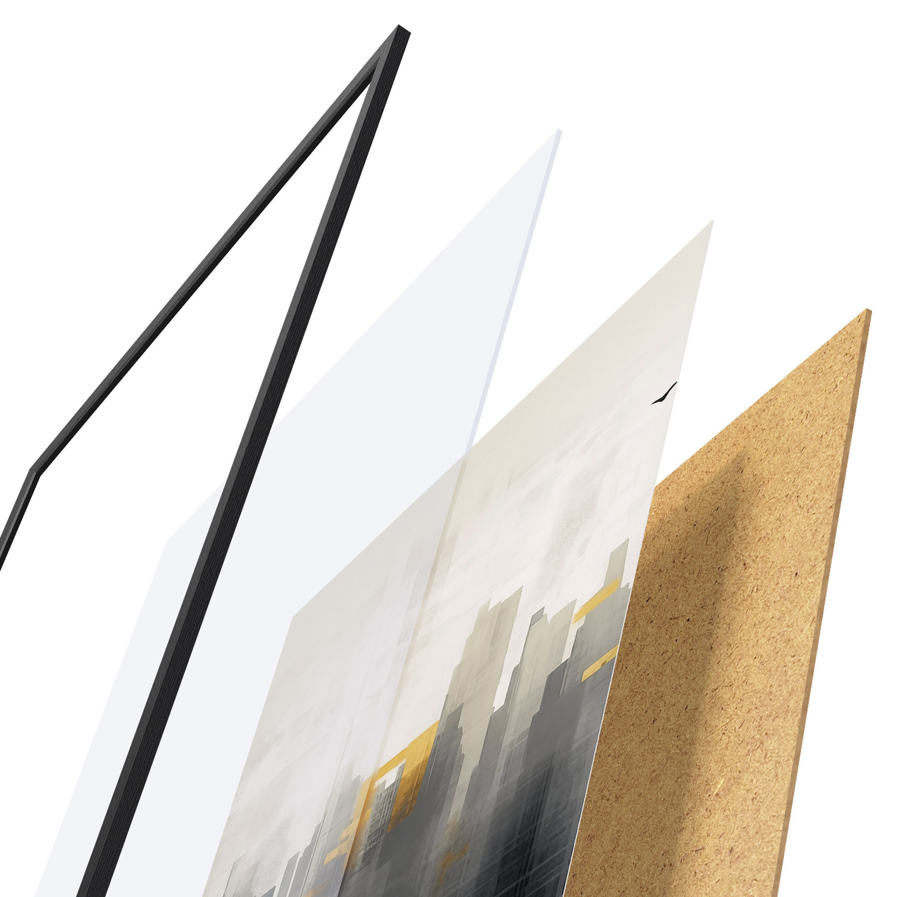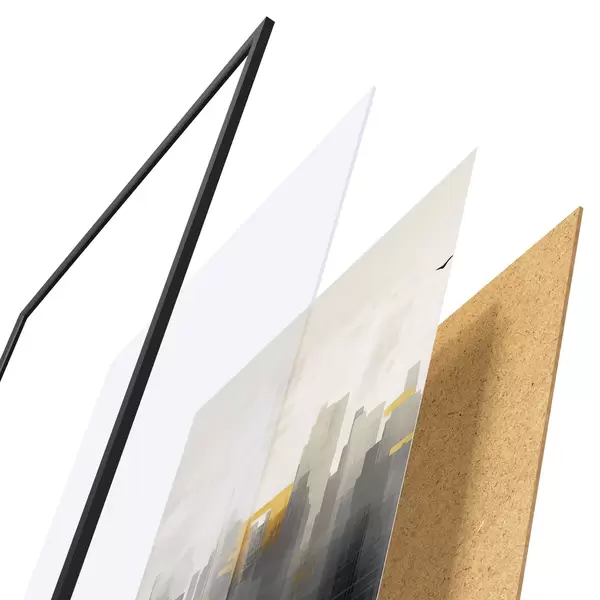 El póster consta de marco, plexiglás, imagen impresa y soporte de aglomerado. El póster puede colgarse inmediatamente en la pared gracias a los soportes de la parte posterior.