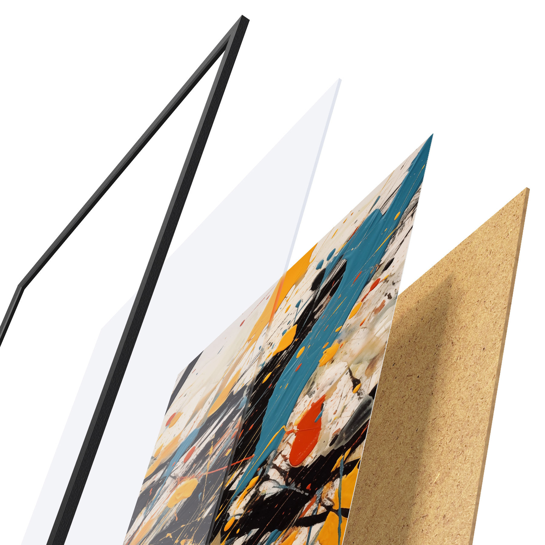 El póster consta de marco, plexiglás, imagen impresa y soporte de aglomerado. El póster puede colgarse inmediatamente en la pared gracias a los soportes de la parte posterior.