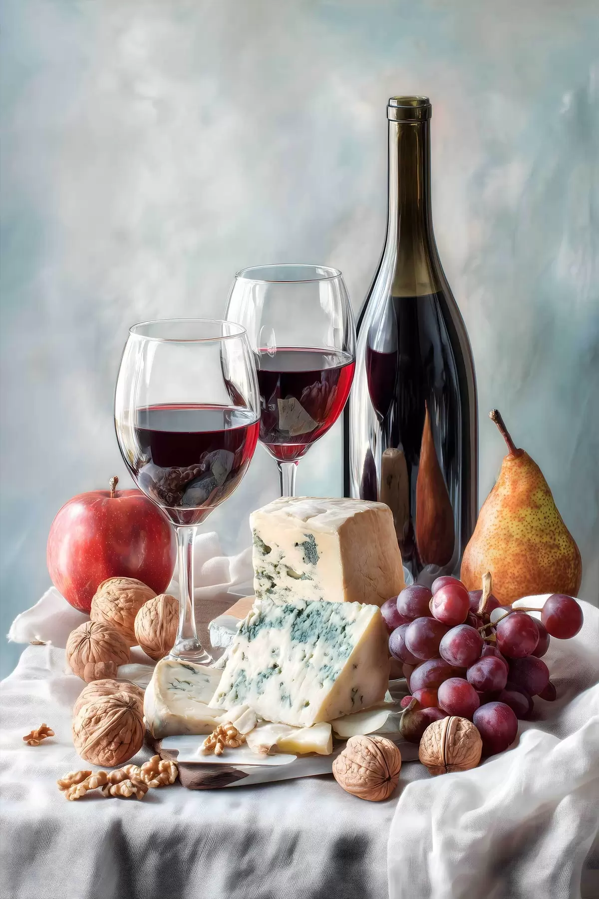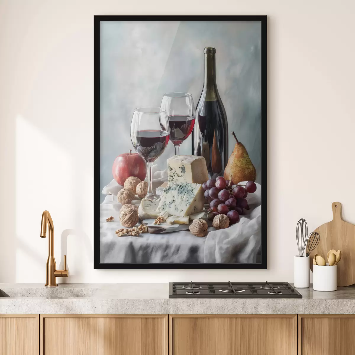 Poster naturaleza muerta con vino, queso y frutos secos Nr f47686