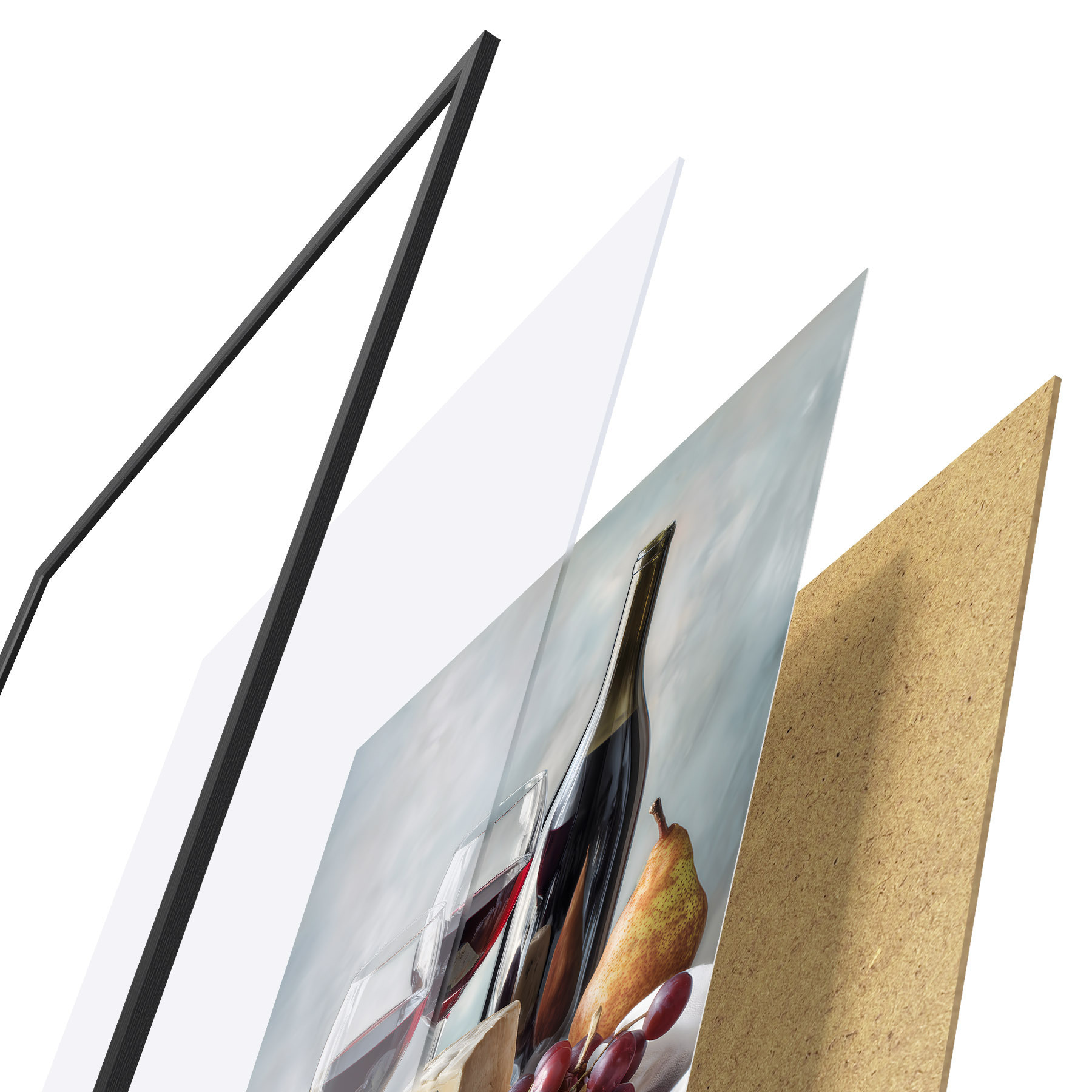 El póster consta de marco, plexiglás, imagen impresa y soporte de aglomerado. El póster puede colgarse inmediatamente en la pared gracias a los soportes de la parte posterior.