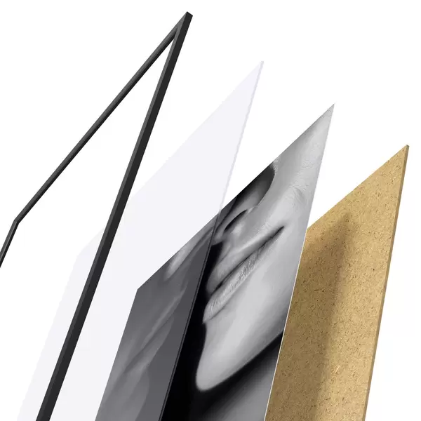 El póster consta de marco, plexiglás, imagen impresa y soporte de aglomerado. El póster puede colgarse inmediatamente en la pared gracias a los soportes de la parte posterior.