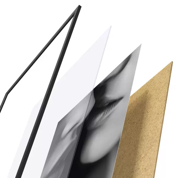 El póster consta de marco, plexiglás, imagen impresa y soporte de aglomerado. El póster puede colgarse inmediatamente en la pared gracias a los soportes de la parte posterior.