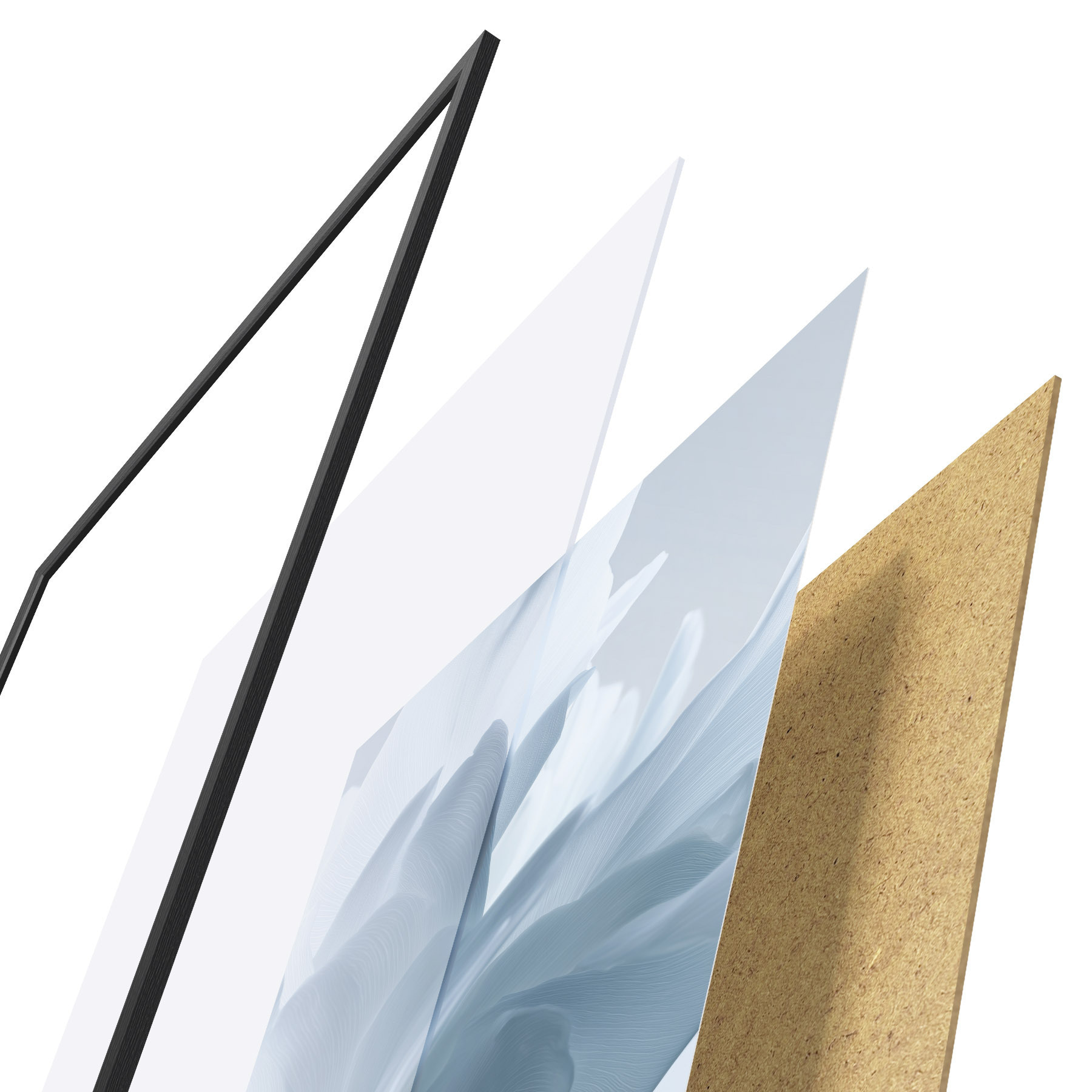 El póster consta de marco, plexiglás, imagen impresa y soporte de aglomerado. El póster puede colgarse inmediatamente en la pared gracias a los soportes de la parte posterior.