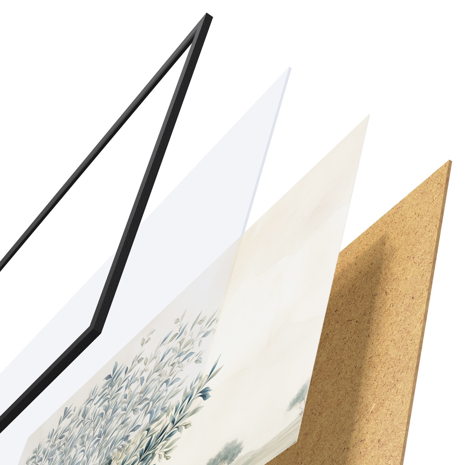 El póster consta de marco, plexiglás, imagen impresa y soporte de aglomerado. El póster puede colgarse inmediatamente en la pared gracias a los soportes de la parte posterior.