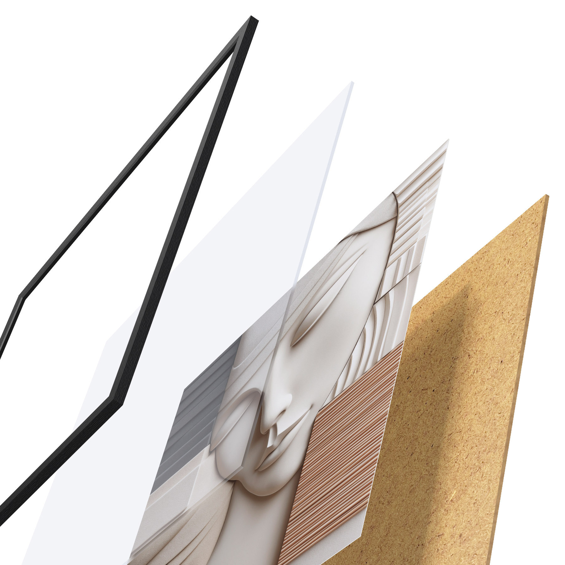 El póster consta de marco, plexiglás, imagen impresa y soporte de aglomerado. El póster puede colgarse inmediatamente en la pared gracias a los soportes de la parte posterior.