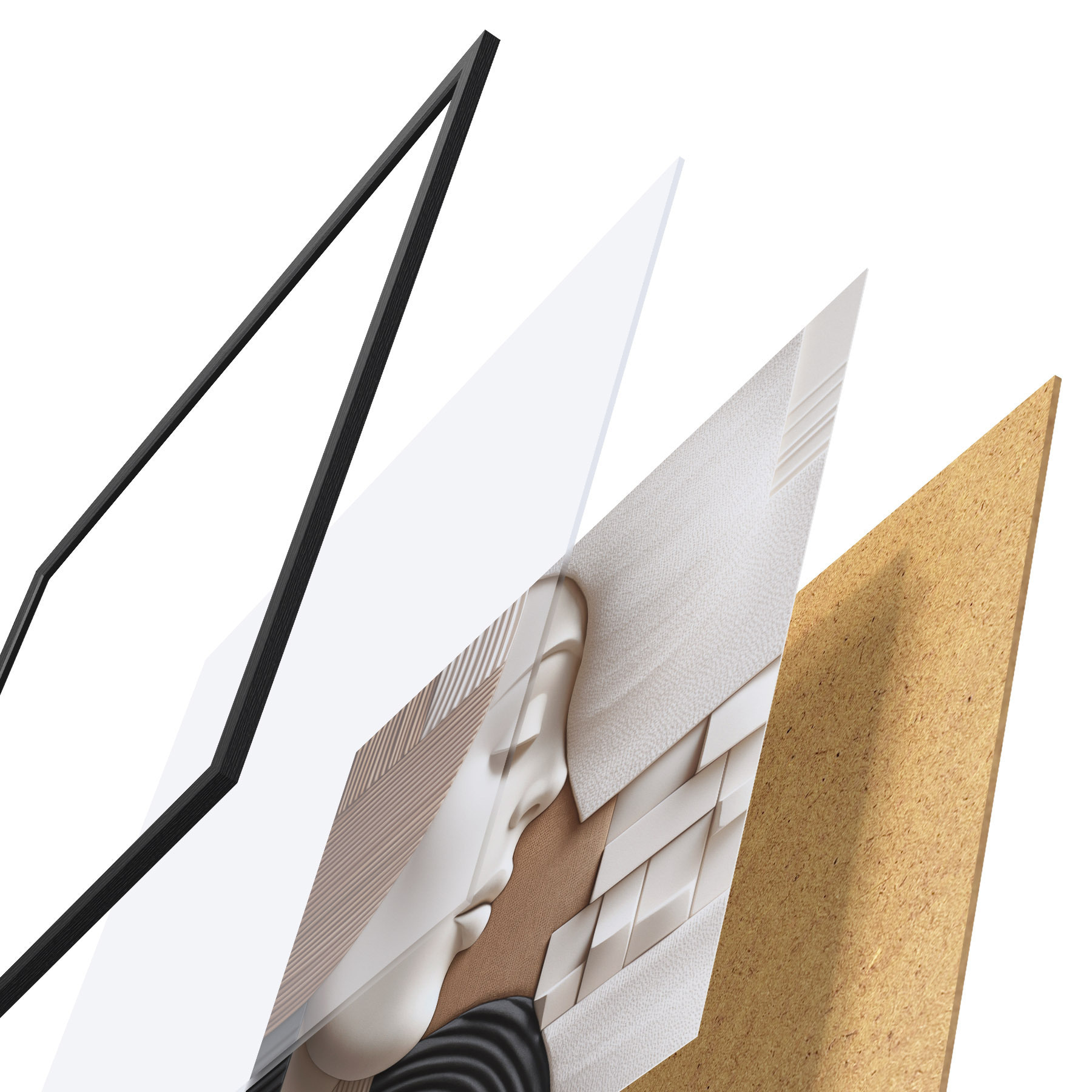 El póster consta de marco, plexiglás, imagen impresa y soporte de aglomerado. El póster puede colgarse inmediatamente en la pared gracias a los soportes de la parte posterior.