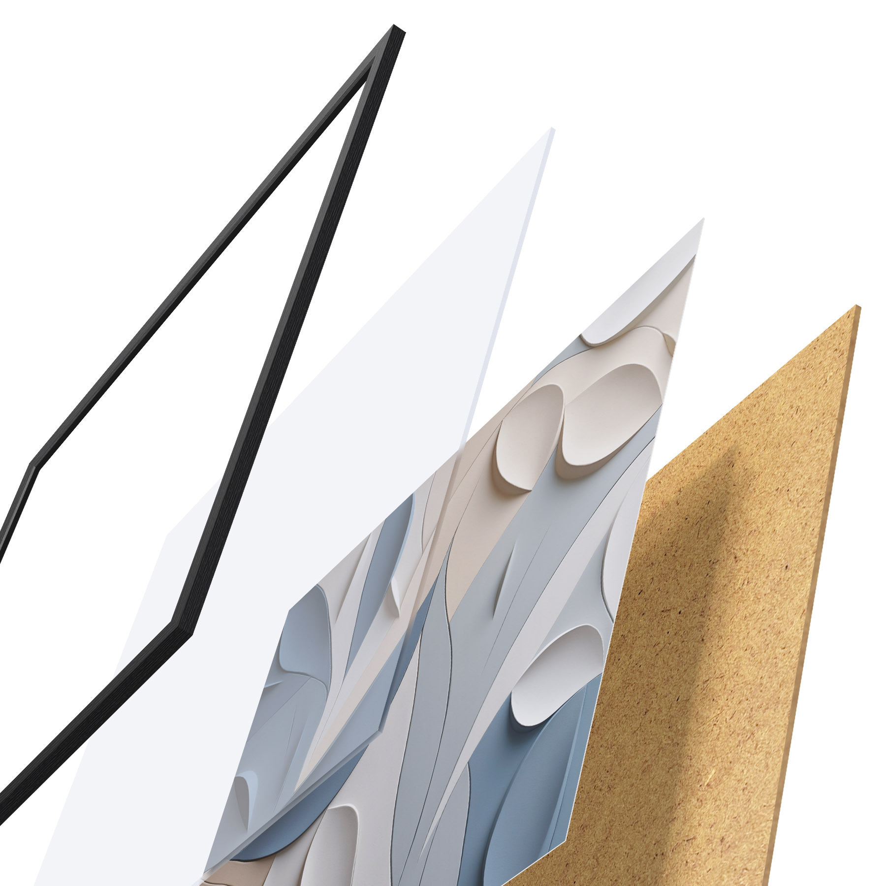 El póster consta de marco, plexiglás, imagen impresa y soporte de aglomerado. El póster puede colgarse inmediatamente en la pared gracias a los soportes de la parte posterior.