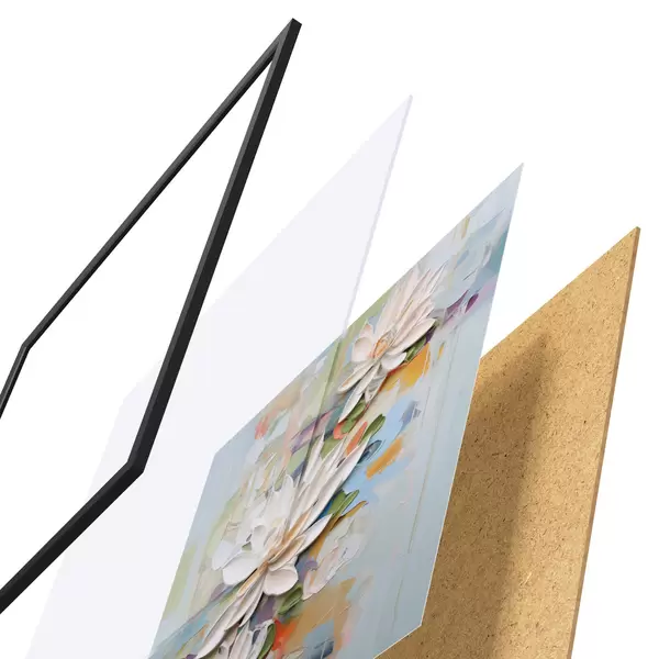 El póster consta de marco, plexiglás, imagen impresa y soporte de aglomerado. El póster puede colgarse inmediatamente en la pared gracias a los soportes de la parte posterior.