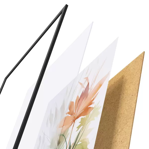 El póster consta de marco, plexiglás, imagen impresa y soporte de aglomerado. El póster puede colgarse inmediatamente en la pared gracias a los soportes de la parte posterior.