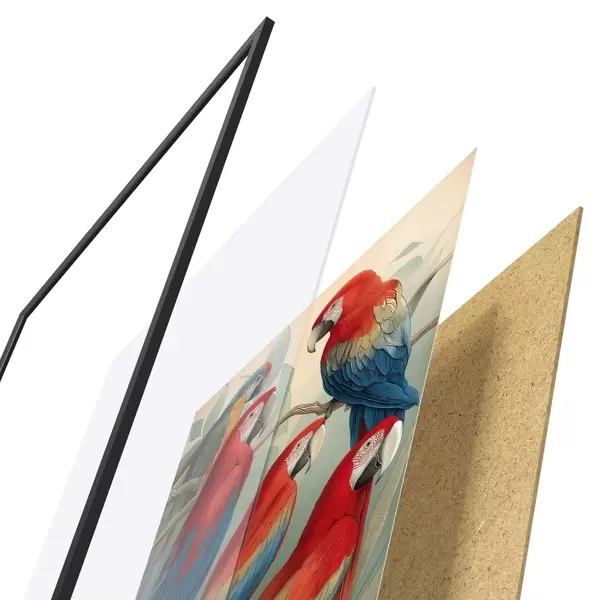 El póster consta de marco, plexiglás, imagen impresa y soporte de aglomerado. El póster puede colgarse inmediatamente en la pared gracias a los soportes de la parte posterior.