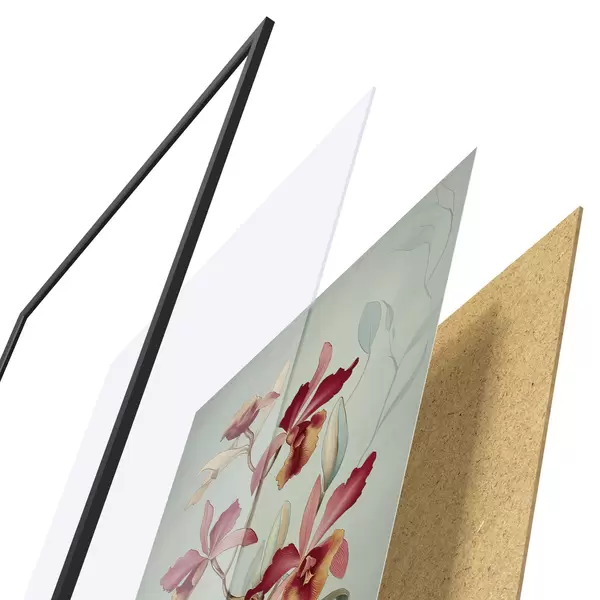 El póster consta de marco, plexiglás, imagen impresa y soporte de aglomerado. El póster puede colgarse inmediatamente en la pared gracias a los soportes de la parte posterior.