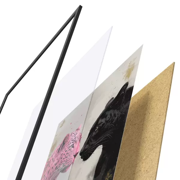 El póster consta de marco, plexiglás, imagen impresa y soporte de aglomerado. El póster puede colgarse inmediatamente en la pared gracias a los soportes de la parte posterior.