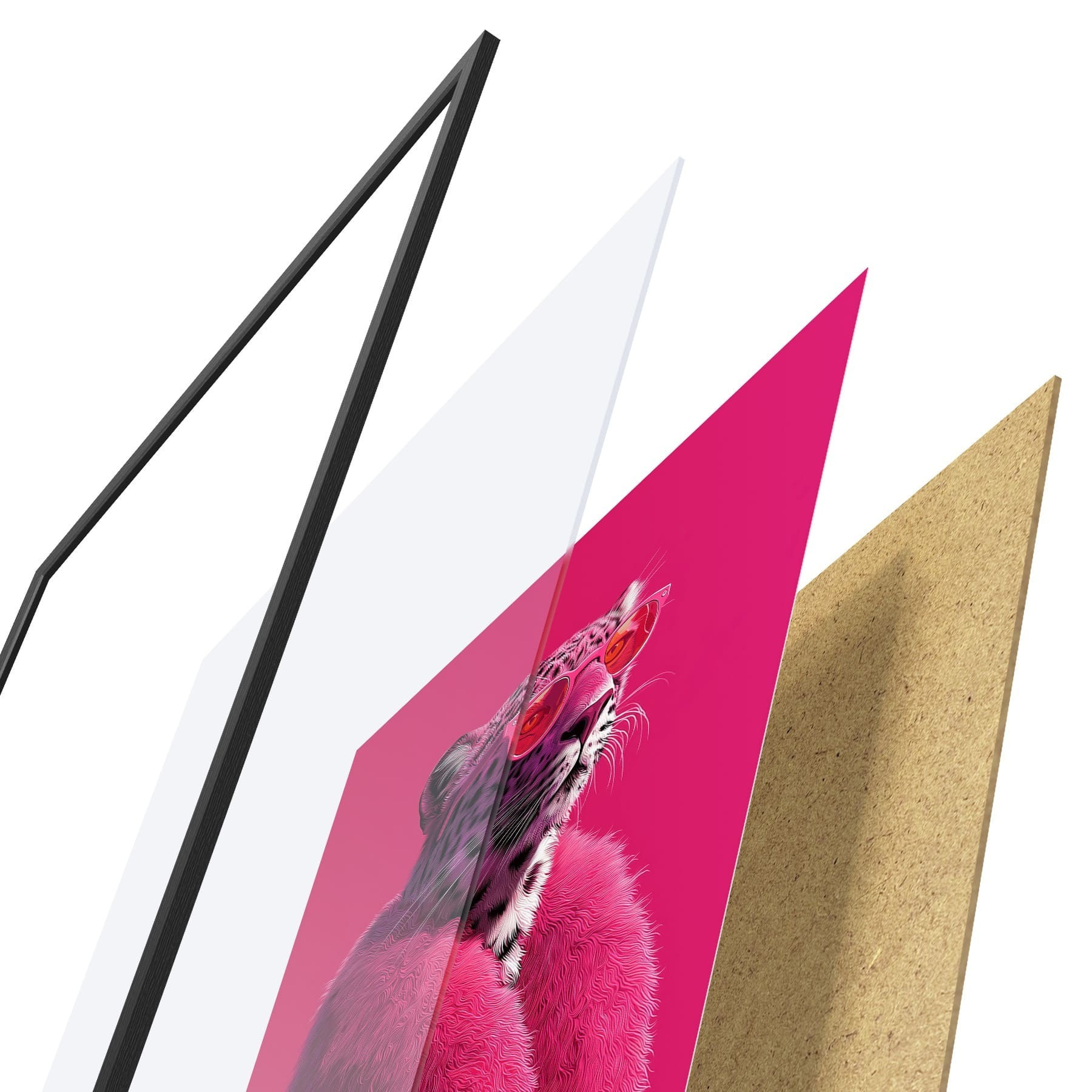 El póster consta de marco, plexiglás, imagen impresa y soporte de aglomerado. El póster puede colgarse inmediatamente en la pared gracias a los soportes de la parte posterior.