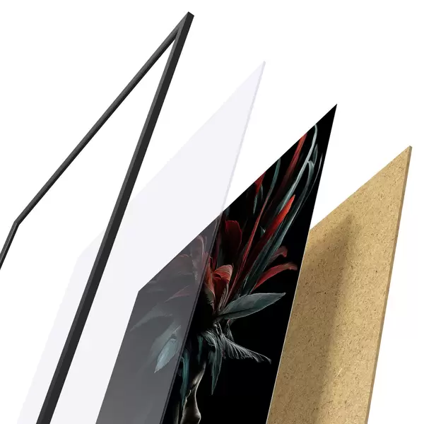 El póster consta de marco, plexiglás, imagen impresa y soporte de aglomerado. El póster puede colgarse inmediatamente en la pared gracias a los soportes de la parte posterior.