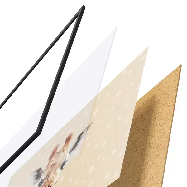 El póster consta de marco, plexiglás, imagen impresa y soporte de aglomerado. El póster puede colgarse inmediatamente en la pared gracias a los soportes de la parte posterior.