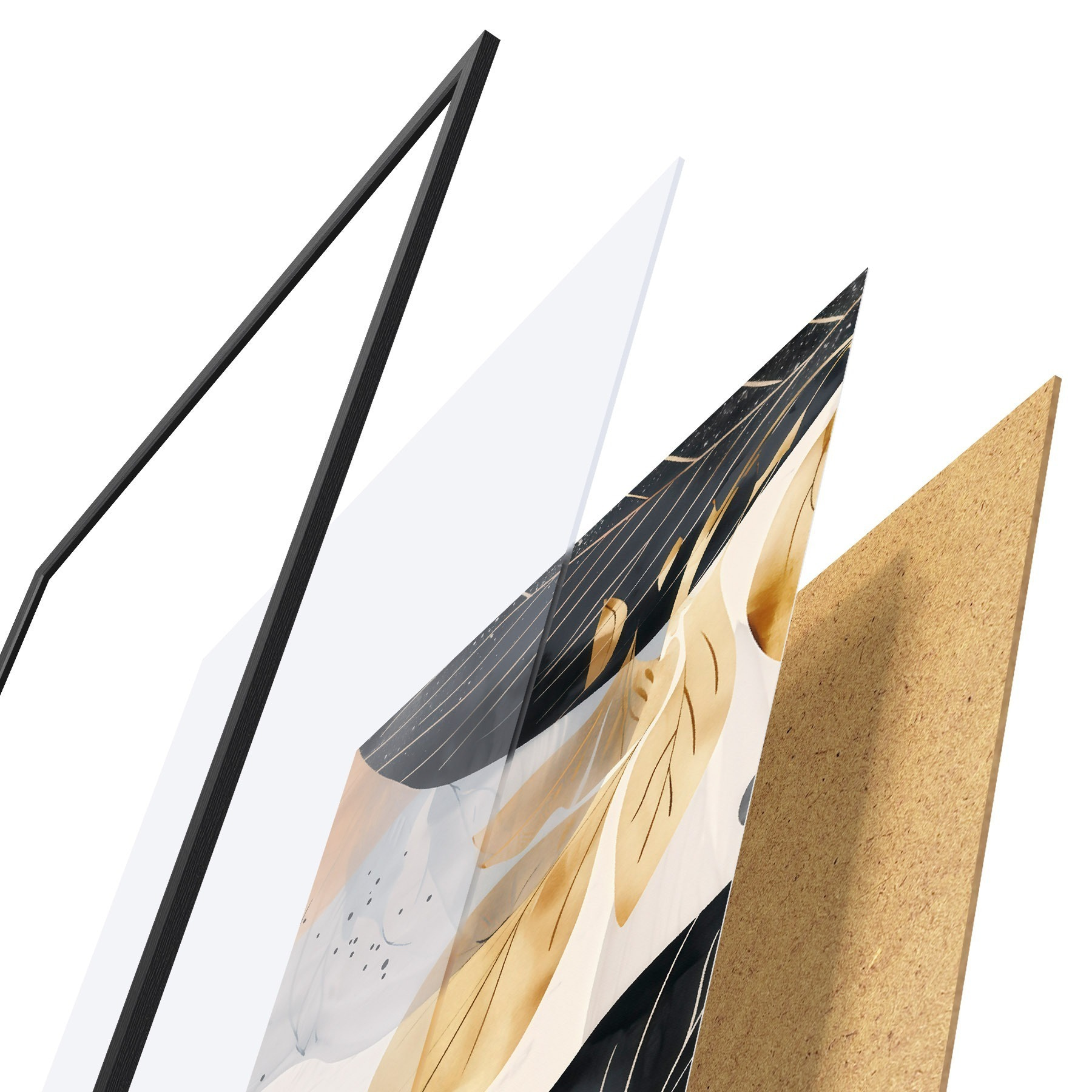 El póster consta de marco, plexiglás, imagen impresa y soporte de aglomerado. El póster puede colgarse inmediatamente en la pared gracias a los soportes de la parte posterior.